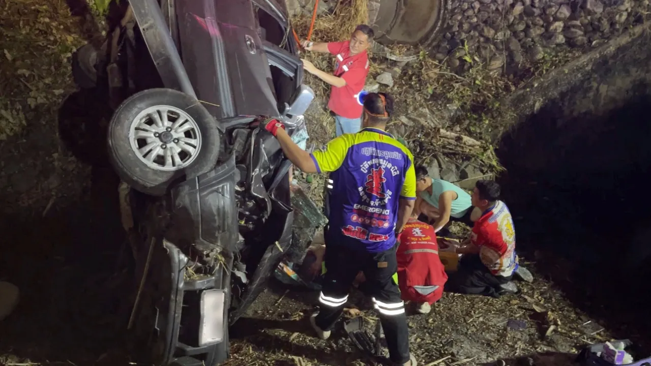 8 ชีวิตระทึก รถเสียหลักพุ่งลงร่องข้างทาง กู้ชีพเร่งใช้เครื่องตัดถ่างช่วยคนติดภายใน