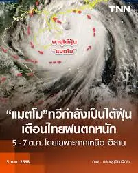 วันที่ 4 ต.ค. 2568 เว็บไซต์กรมอุตุนิยมวิทยา ประกาศเรื่อง “พายุ “ ฉบับที่ 3 เมื่อเวลา 04.00 น. ของวันนี้ (4 ต.ค.) พายุโซนร้อนกำลังแรง บริเวณทะเลจีนใต้ตอนบน มีศูนย์กลางอยู่ที่ละติจูด 17.7 องศาเหนือ ลองจิจูด 117.4 องศาตะวันออก ความเร็วลมสูงสุดใกล้ศูนย์กลางประมาณ 100 กิโลเมตรต่อชั่วโมง กำลังเคลื่อนตัวทางทิศตะวันตกค่อนทางเหนือเล็กน้อย ด้วยความเร็วประมาณ 25 กิโลเมตรต่อชั่วโมง